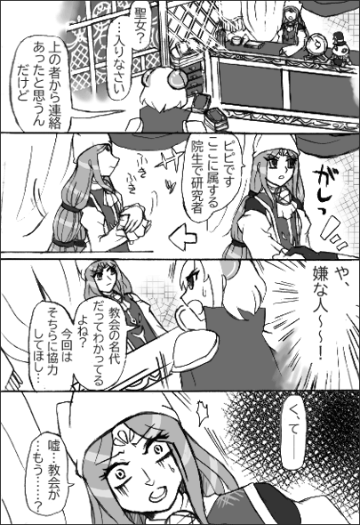 凹まずにいられるのは、聖女の仕事という名目があるのと、一応の責任感?使命感?を持ってるから。戦場に放り出されるよりは、人と話す方がマシですよう!(仕事じゃなかったら帰りたい)