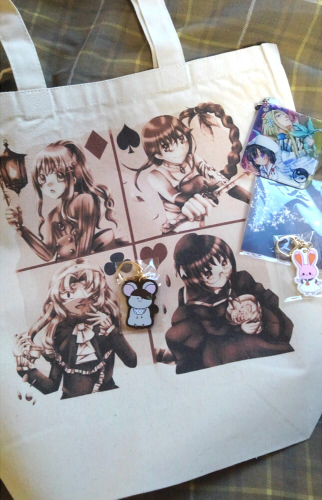 生地がベージュっぽい色+白版敷かずに印刷する(だいぶ薄くなる)仕様だったので、セピア調にしてみたり。萌え感?が抑えられて、普段使いしやすくなるかなって…。