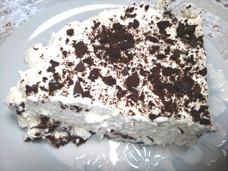 焼かなくていい、チーズの風味がするふわふわクリームケーキで、チョコクッキー(オレオ)がいいアクセントになってます。ただカロリーは推して知るべし。