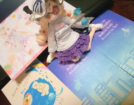 妹から同人誌も頂きましたよん。表紙デザインに携わらせて頂いたやつ。あ、シィラドールの後ろに敷いてあるのはアゾンさんから頂いたカレンダーね(滑り止めに使った)。