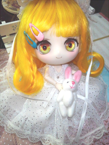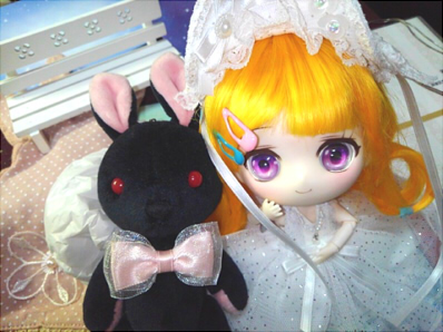 オレンジの髪×紫の瞳でハロウィンっぽくなるかな?って黒ウサぬいぐるみを傍に置いたものの、白ワンピが清廉でそうはならなかった。KAWAII。