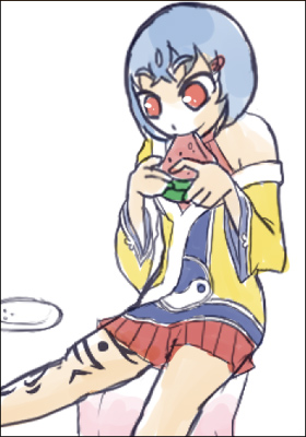 暑中見舞いのラフ。スイカパクつく樂夏(らくか)ちゃん。