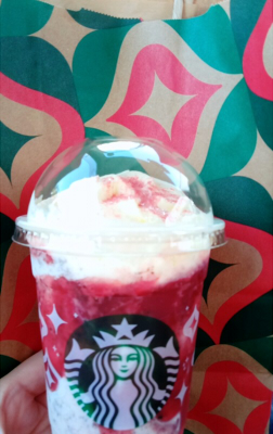 クリスマスメニュー第1弾である、ストロベリーメリークリームフラペチーノ。
