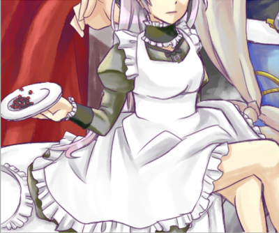 新しく描いた絵も、「エプロンドレスのエプロン部分から直接生足が出てるように見えたら色っぽいだろうな」って煩悩で突っ走っておりますからね(…) ちゃんと下にスカートがあるのに、ってのがいいんです。