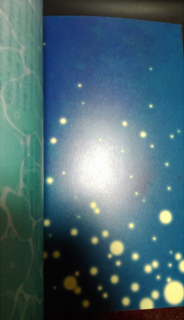 期間限定のサマーメモリーセットで表紙2-3(表紙と裏表紙の裏側)には光の立ち昇る夜の風景を、遊び紙には水面の模様を入れて貰ってるんですよ。更に後者はトレーシングペーパーゆえ、本文が透けて見えるんです。水らしさマシマシだぜ。