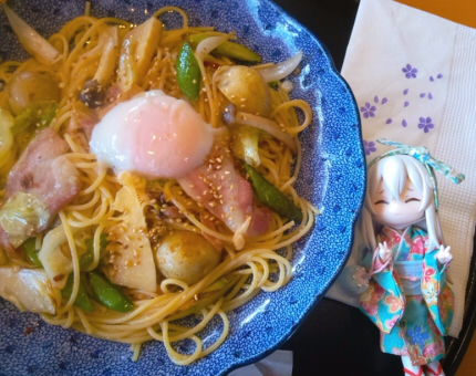 フライング誕生日祝いに、外食して参りました。イベリコ豚と春野菜のスパゲッティを頂きましたよ。