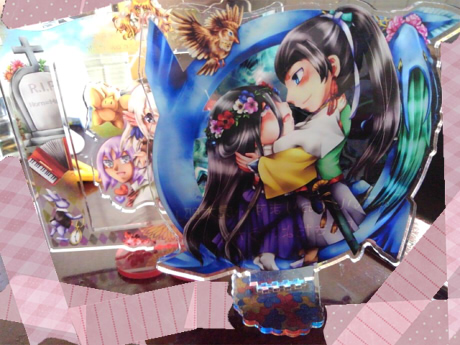 ホワイトデーフェアの花束台座を使用させて頂きました。絵の雰囲気に合うかなと思いまして。輪っか(?)の内部は半透明で、裏面にはセリフを印刷して貰ってます。