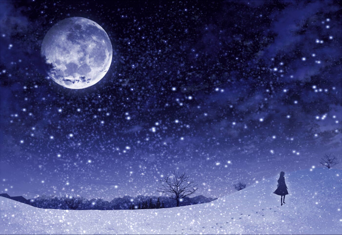 『月灯り、雪ナミダ』のプロローグ&終章のイメージ。青白く光るお月様と降り続ける雪、1人歩く少女の図。