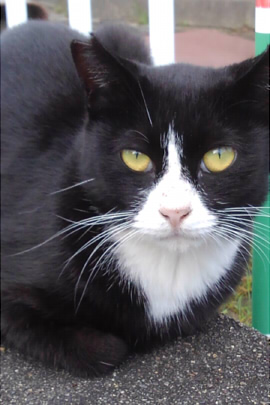 いつもの散歩道にいつものぬこあり。白黒金目ちゃんです。こんな近くに寄っても警戒がぬぇー!