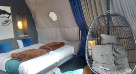 目的地のグランピング施設に着いたわけですねー!! 冷房の行き届いたテントに近いコテージ、最高だあ(><///)