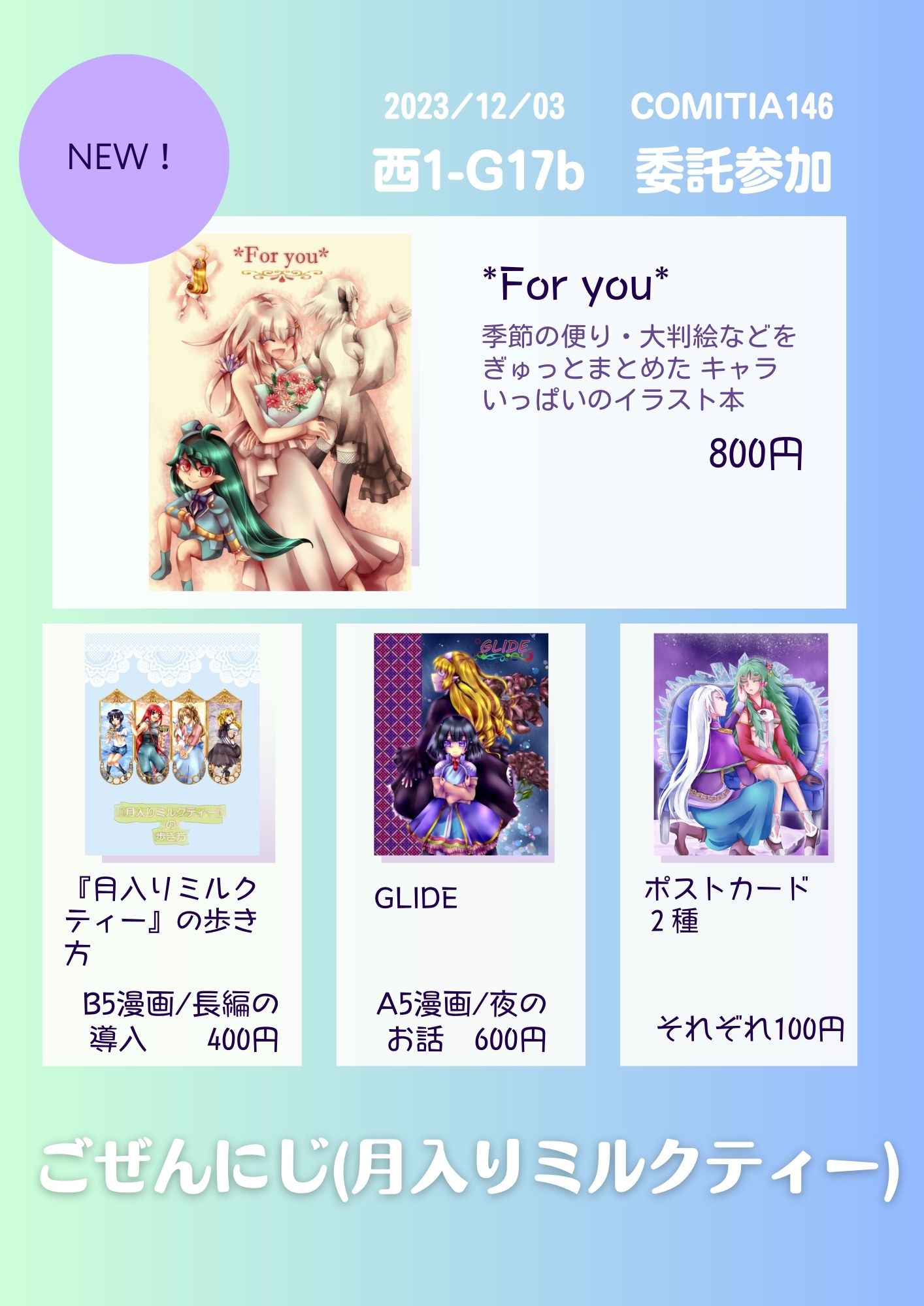 新刊として今までの季節の絵や大判イラストなどをまとめた”*For you*”、長編のさわりとなる”『月入りミルクティー』の歩き方”、Boothで販売している”GLIDE”の3作品を持っていく予定です。あとポストカード2種と無配の名刺。