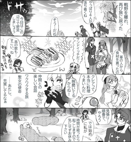 みんなで野宿して一緒にご飯食べたり、夜の番を決めたり。冒険者パーティーっぽいことしております。